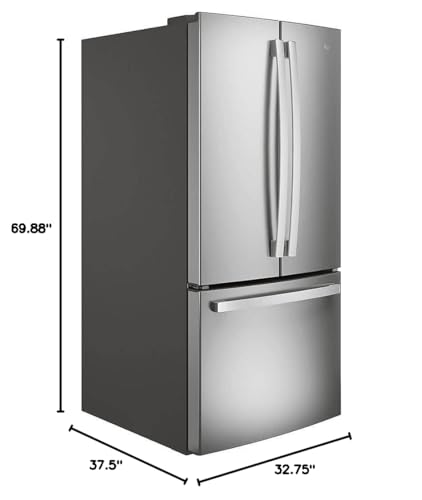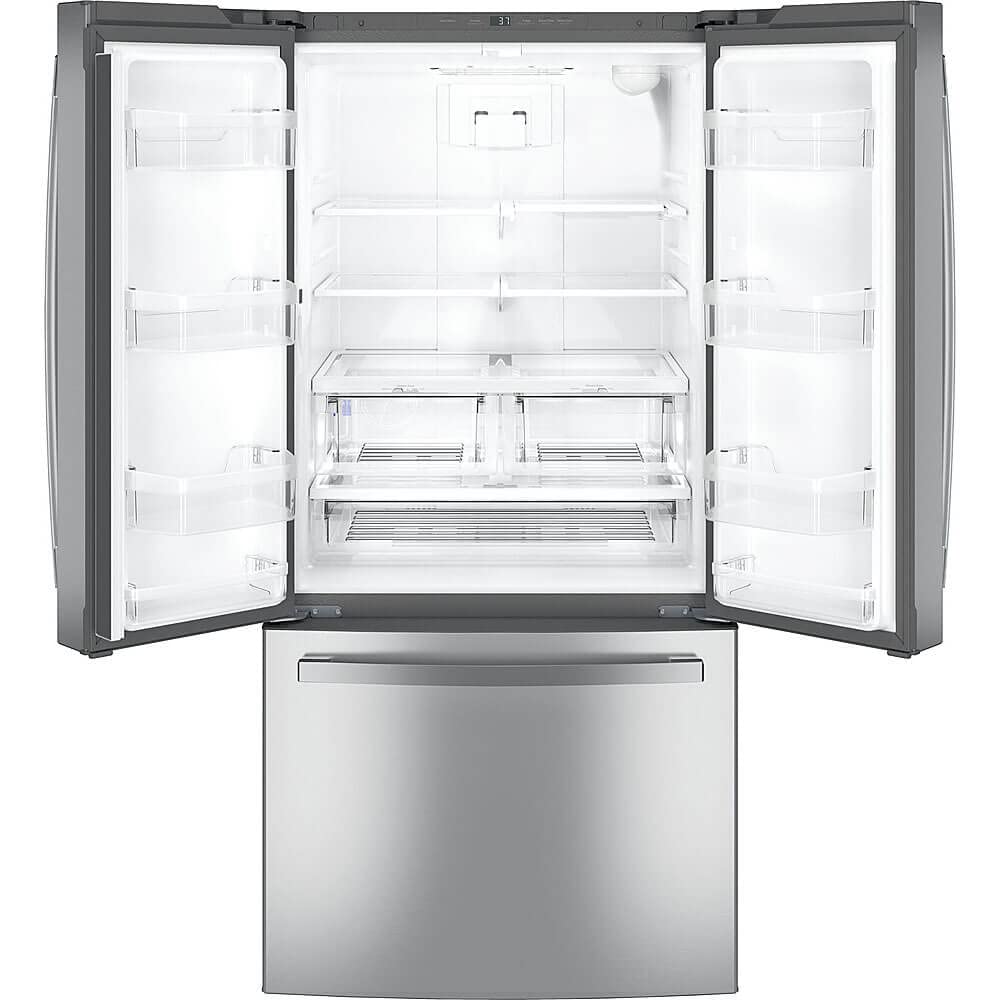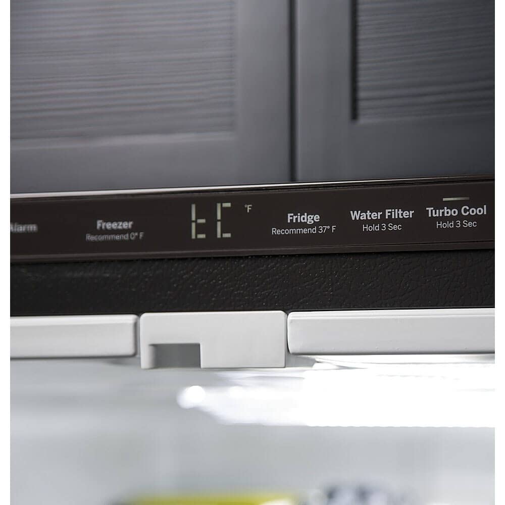 Details: GE Appliances is your home for the best kitchen appliances, home products, parts and accessories, and support. Fingerprint Resistant Stainless 33" width Factory-installed icemaker with water filtration system Dimensions: 69 7/8 H x 32 3/4 W x 37 1/2 D Fingerprint Resistant Stainless Easily wipe away smudges and fingerprints for a look that's always sparkling clean Play Video 33" width A compact design fits in smaller spaces, yet still offers the large storage capacity of a French-door refrigerator Factory-installed icemaker with water filtration system Refrigerator comes ready to automatically create filtered ice Play Video Internal water dispenser Delivers filtered water with one touch Play Video LED lighting Find exactly what you’ve been looking for under crisp, clear lighting Play Video Two humidity-controlled drawers and full-width drawer Create the right environment for keeping fruits and vegetables fresh, while easily storing wider items like a party platter or a sheet cake Two-level freezer storage baskets Baskets allow easy access to frozen foods Internal controls with actual-temperature display Eliminate the guesswork of temperature setting with actual degrees displayed digitally Quick Space shelf Quickly slides out of the way to make room for tall items Play Video Advanced water filtration Reduces trace pharmaceuticals from water and ice* (* Removes 98% of ibuprofen, atenolol, fluoxetine, progesterone and trimethoprim. These pharmaceuticals are not necessarily in all users’ water) Play Video Spill-proof shelves A variety of shelf configurations provide additional options for food storage Gallon door storage Deep bins handle large containers in the door and free up valuable shelf space Turbo Cool and Turbo Freeze settings An extra boost of cold air restores interior to set temperature for optimum food freshness Door alarm Enjoy peace of mind knowing the refrigerator door is never left open Enhanced Shabbos Mode The Shabbos Keeper connects to your refrigerator to automatically enable Shabbos compatible modes each week and before every holiday (Shabbos Keeper sold separately, visit www.zmantechnologies.com for details) Energy Guide Installation Instructions Use and Care Manual Quick Specs