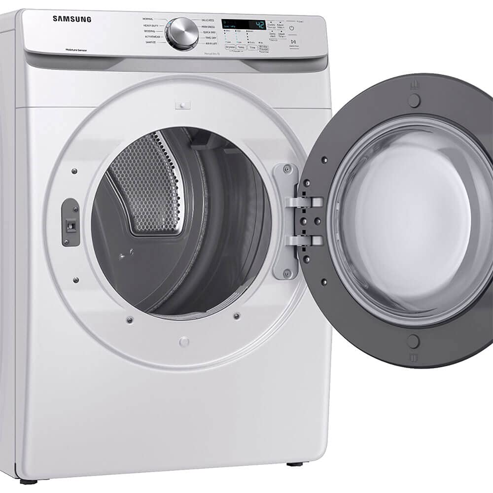Details: 27 Inch Wide 7.5 Cu. Ft. Gas Dryer with Smart Care Product Specifications: SKU: DVG45T6000W Finish: White Manufactured By: Samsung Depth: 31.5 in. Depth with Door Open: 123 in. Height: 38.75 in. Nominal Depth: 32 in. Nominal Height: 39 in. Nominal Width: 27 in. Product Weight: 123 Total Capacity: 7.5 cu. ft. Width: 27 in. Interior Light: Yes Pedestal Included: No App Compatibility: Samsung Smart Home Child Lock: Yes Configuration: Gas Front Loading Dryer Control Type: Knob and Digital Display Type: Digital Drum Material: Steel End of Cycle Indicator: Yes Fingerprint Resistant: No Front Loading: Yes Hinging: Reversible Leveling Legs: Yes LP Conversion: Yes Reversible Door: Yes Sensor Dry: Yes Stackable: Yes Steam Technology: No Top Loading: No Vent Type: 3 Way Venting Viewing Window: Yes Dryer Type: Gas Number of Dry Cycles: 10 Temperature Settings: 5 Voltage: 120 ADA: Yes Country Of Origin: Mexico Energy Star: No Manufacturer Warranty: 1 Year Limited